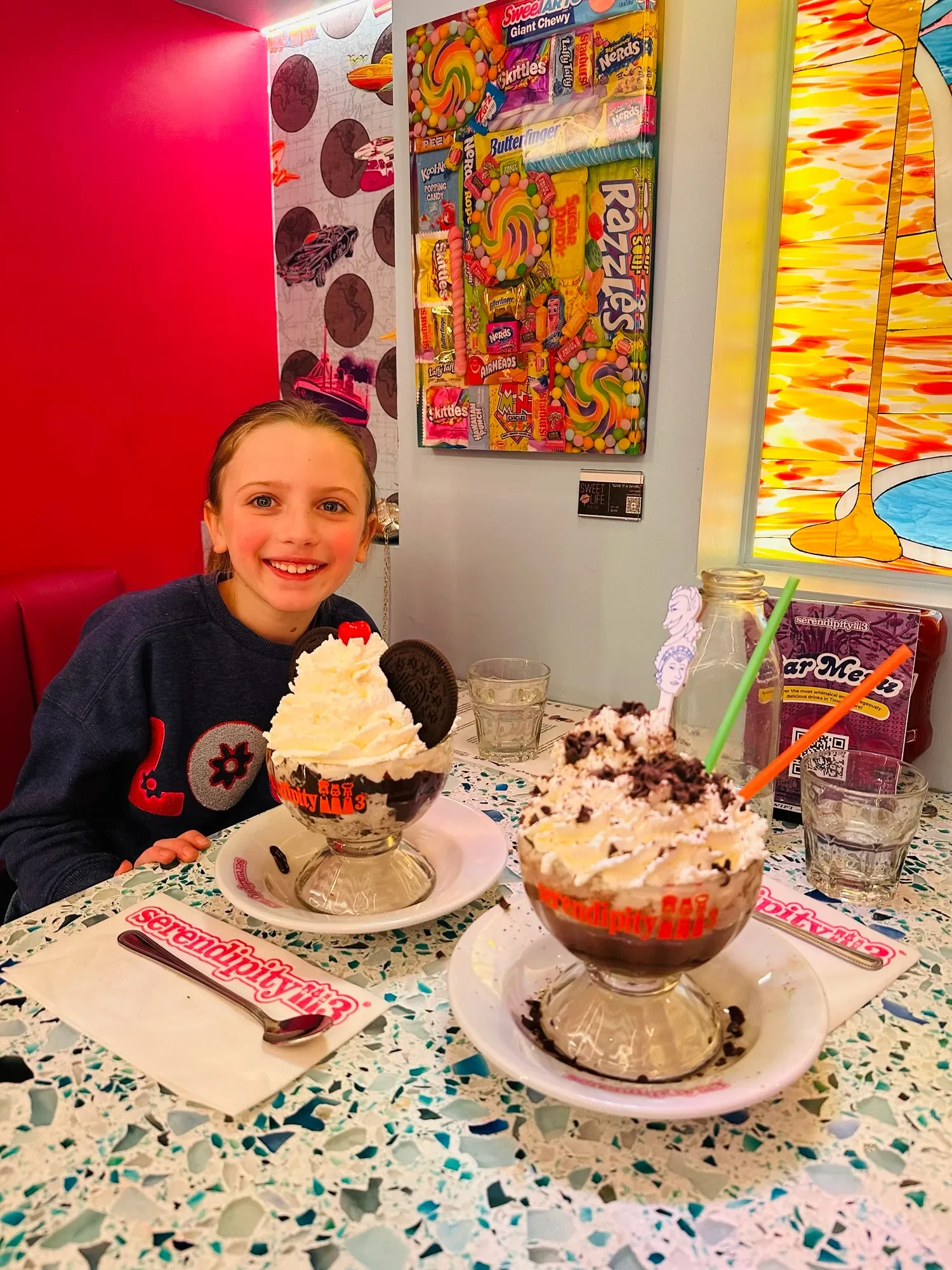 We had until 1pm the next day to get our last dose of NYC before heading home so we hit the ground running after breakfast and headed to Rockefeller Center to take in the holiday magic and then explored all the kid-approved flagship stores we could - American Girl, M&M, Lego, and Sephora. Before heading back to the train station we grabbed lunch and frozen hot chocolate (gigantic) and an ice cream sundae (also gigantic) at Serendipity because it was a "yes" weekend and why not. It's got a super fun, sweets-themed vibe that definitely appeals to kids and she thought it was amazing. After ending our whirlwind 24 hours with a sugar coma, we made our way to the train station and snuggled up for the train ride back to DC.
